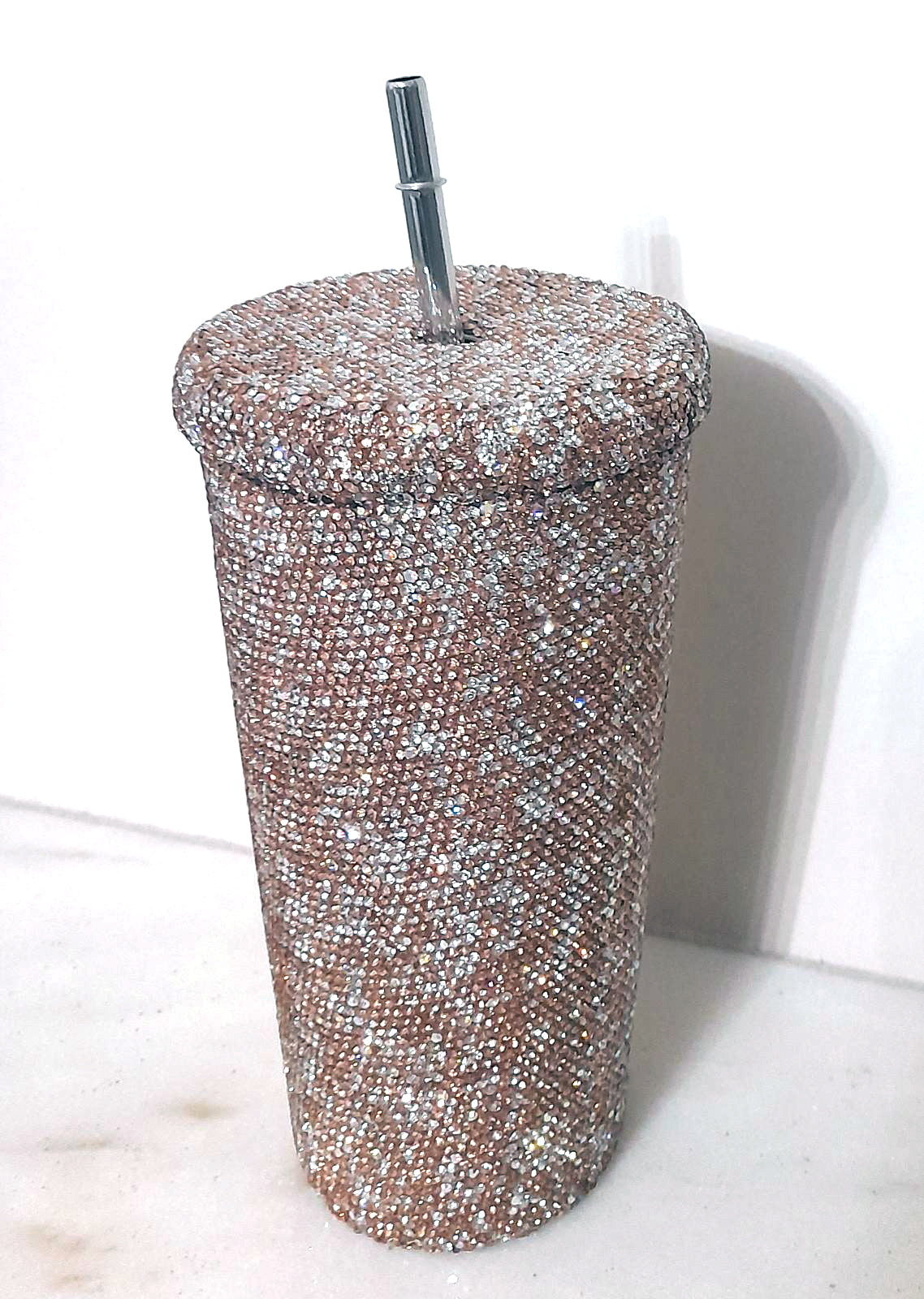 Θερμό ποτήρι με στρας ασημί και χρυσά με καλαμάκι μεταλλικό.