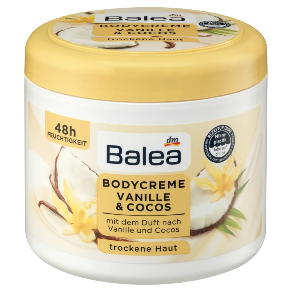 Η κρέμα σώματος Balea Vanilla & Coconut είναι ιδανική για ξηρό δέρμα και το αφήνει αισθητά απαλό. Το σύμπλεγμα περιποίησης με λάδι καρύδας και εκχύλισμα καρύδας μπορεί να βελτιώσει την ελαστικότητα του δέρματος και να του προσφέρει καταπραϋντική ενυδάτωση για έως και 48 ώρες. Η σύνθεση είναι απαλλαγμένη από μικροπλαστικά και υδατοδιαλυτά, καθαρά συνθετικά πολυμερή.